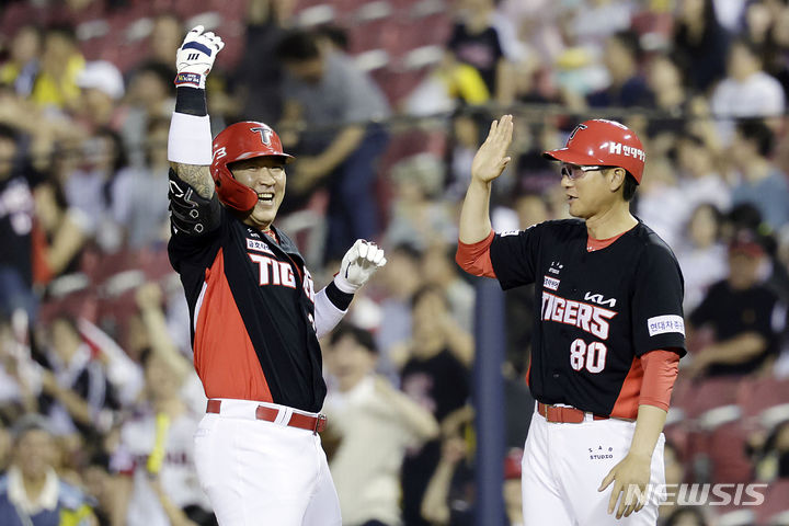 [ê´ì£¼=ë´ìì¤] ì ´ì˜ ì£¼ ê¸°ìž = 3ì ¼ 오후 괒주 ë¶ êµ¬ ê´ì£¼-ê¸°ì•„ì±”í”¼ì– ¸ìŠ¤í•„ë“œì— ì„œ 열린 2024 ì‹ í•œ SOLë±…í ¬ KBO리그 KIA íƒ€ì ´ê±°ì¦ˆ 대 LG íŠ¸ìœˆìŠ¤ì ˜ 경기, 4회 ë§ KIA ê¹€ë „ì˜ ì ´ ê¹€ì„ ë¹ˆì ˜ ì•ˆíƒ€ì— í™ˆì ¸í•´ ë •ì•„ì›ƒì— ì„œ ë ™ë£Œë“¤ê³¼ ì ¸ì‚¬í•˜ê³ ìžˆë‹¤. 2024.09.03. [email protected]