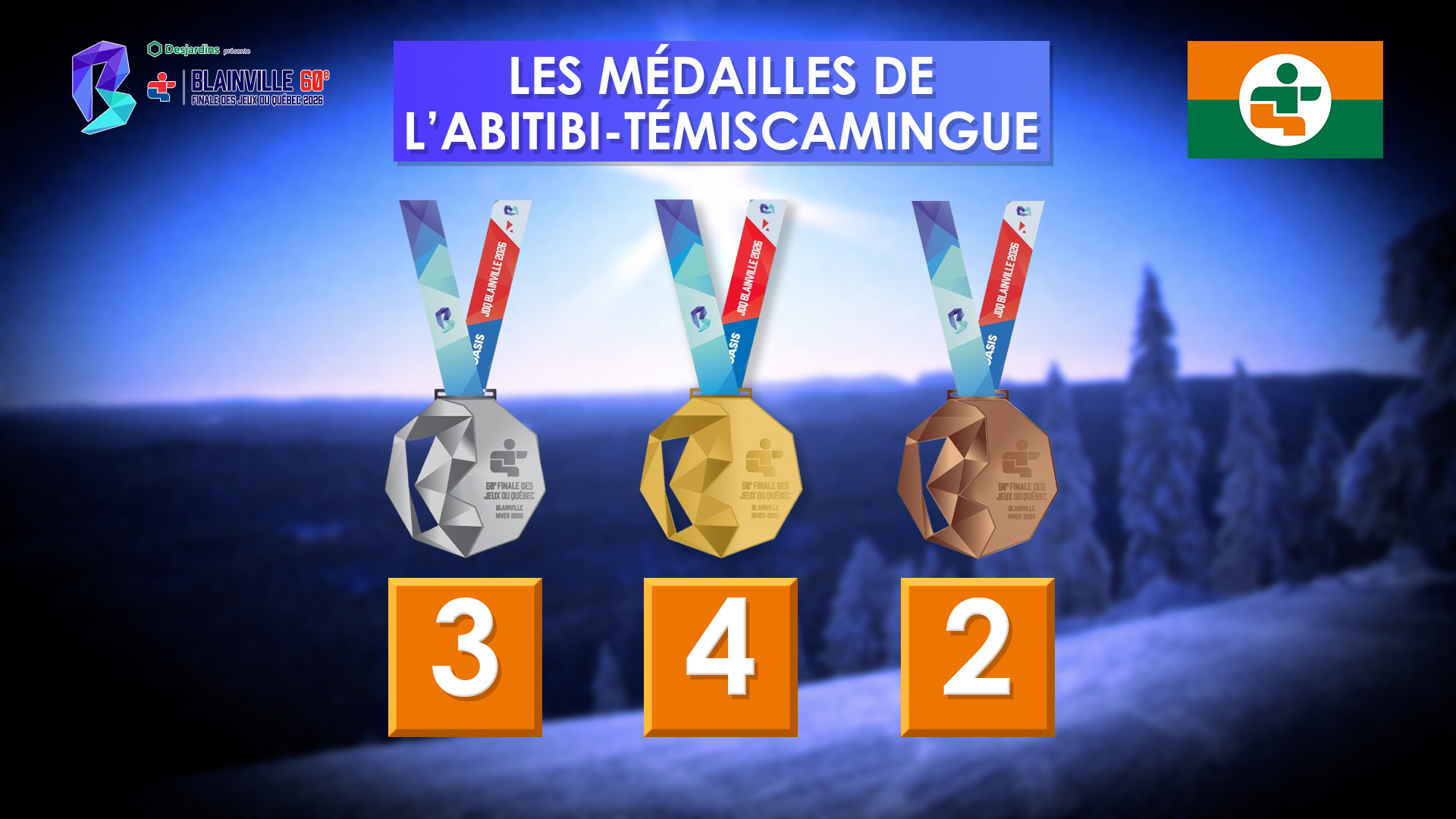 The Abitibi-Témiscamingue delegation secured four gold medals, three silver medals, and two bronze medals. Six of these medals were won during the first block of competition, with an additional three earned in the second block.